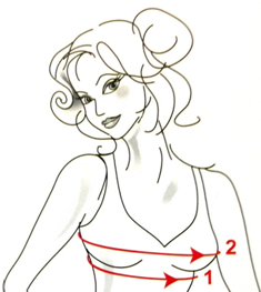 1. Обхват под грудью. При этом сантиметровая лента располагается параллельно полу. (Например, обхват под грудью равен 85 см.)